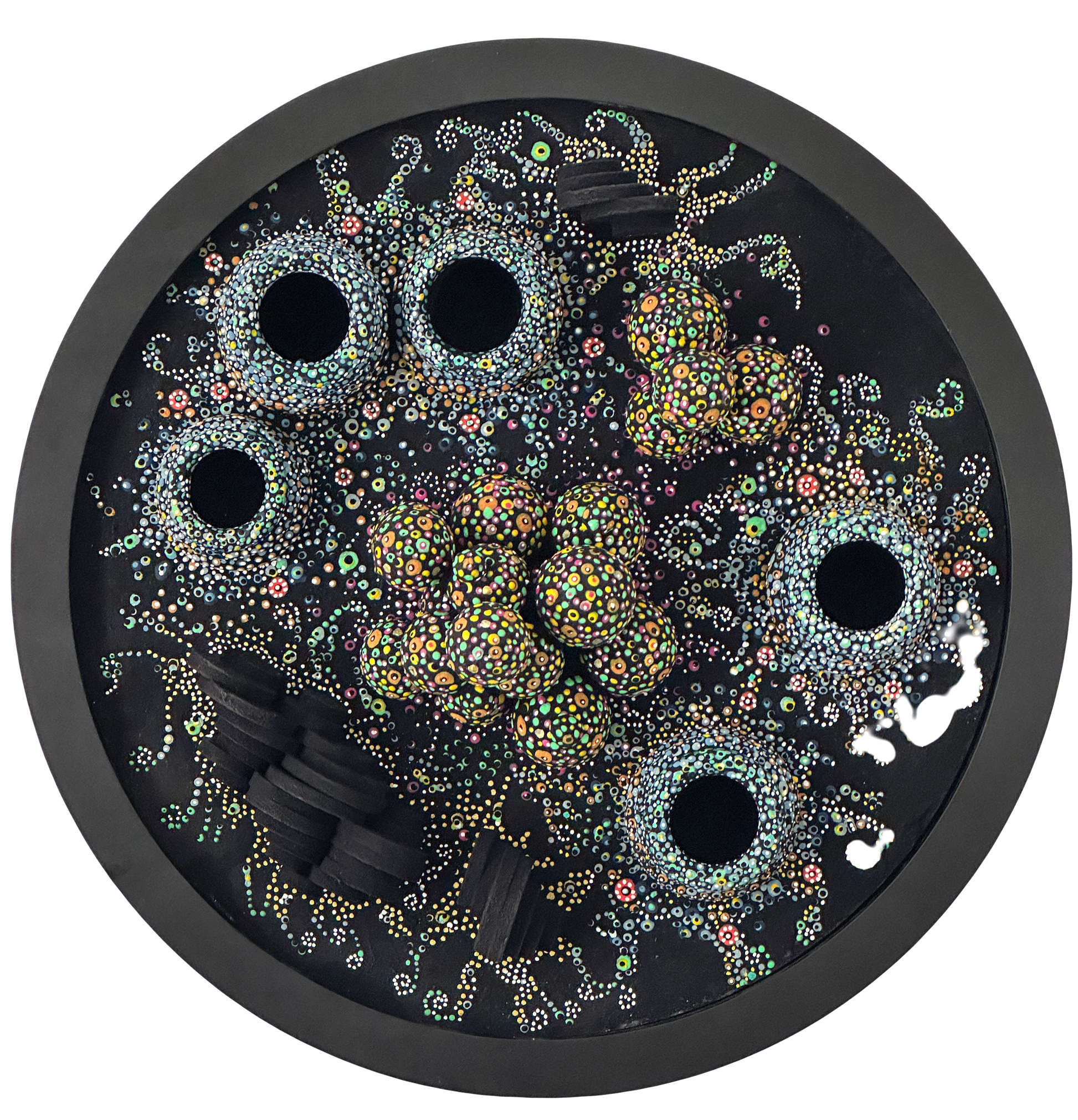 “Trio” explores the tension and harmony between natural growth and structured void. Three central black holes anchor the piece, surrounded by vibrant, cellular-like clusters built from layered dot work.